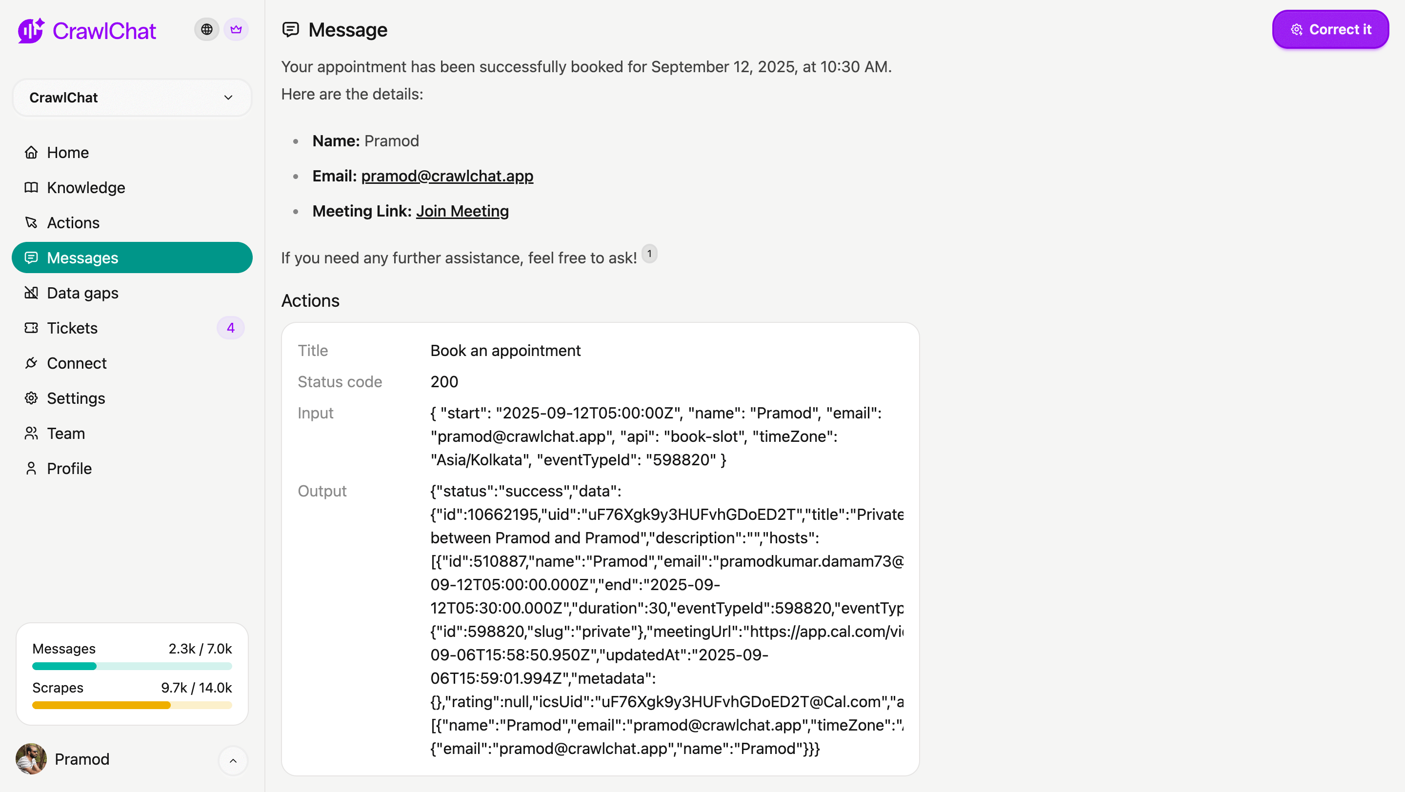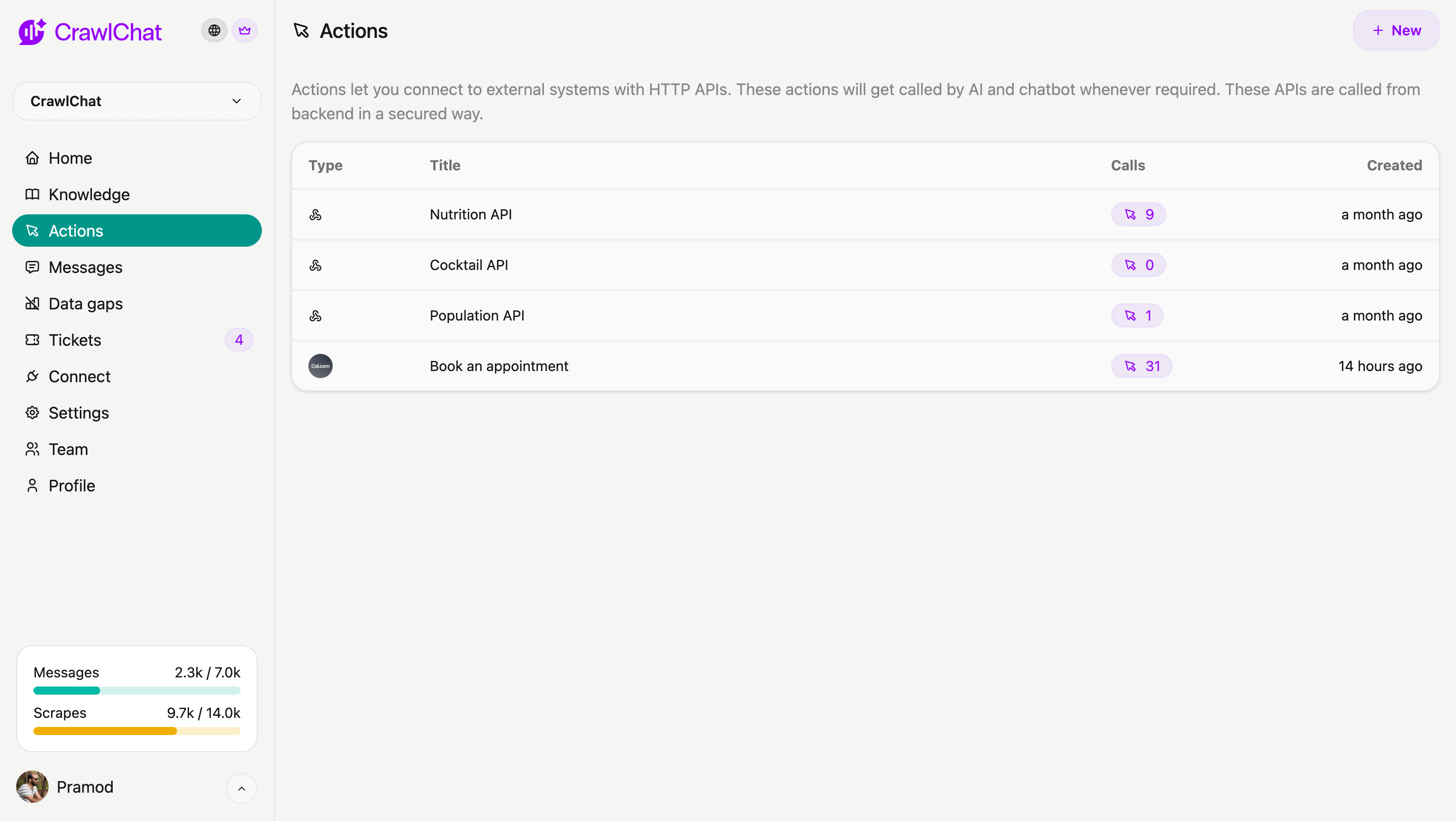 CrawlChat Actions let chatbots call APIs to fetch data or perform tasks. Configure with URL, method, and data. Logged in analytics, executed securely on servers, with sensitive details protected.