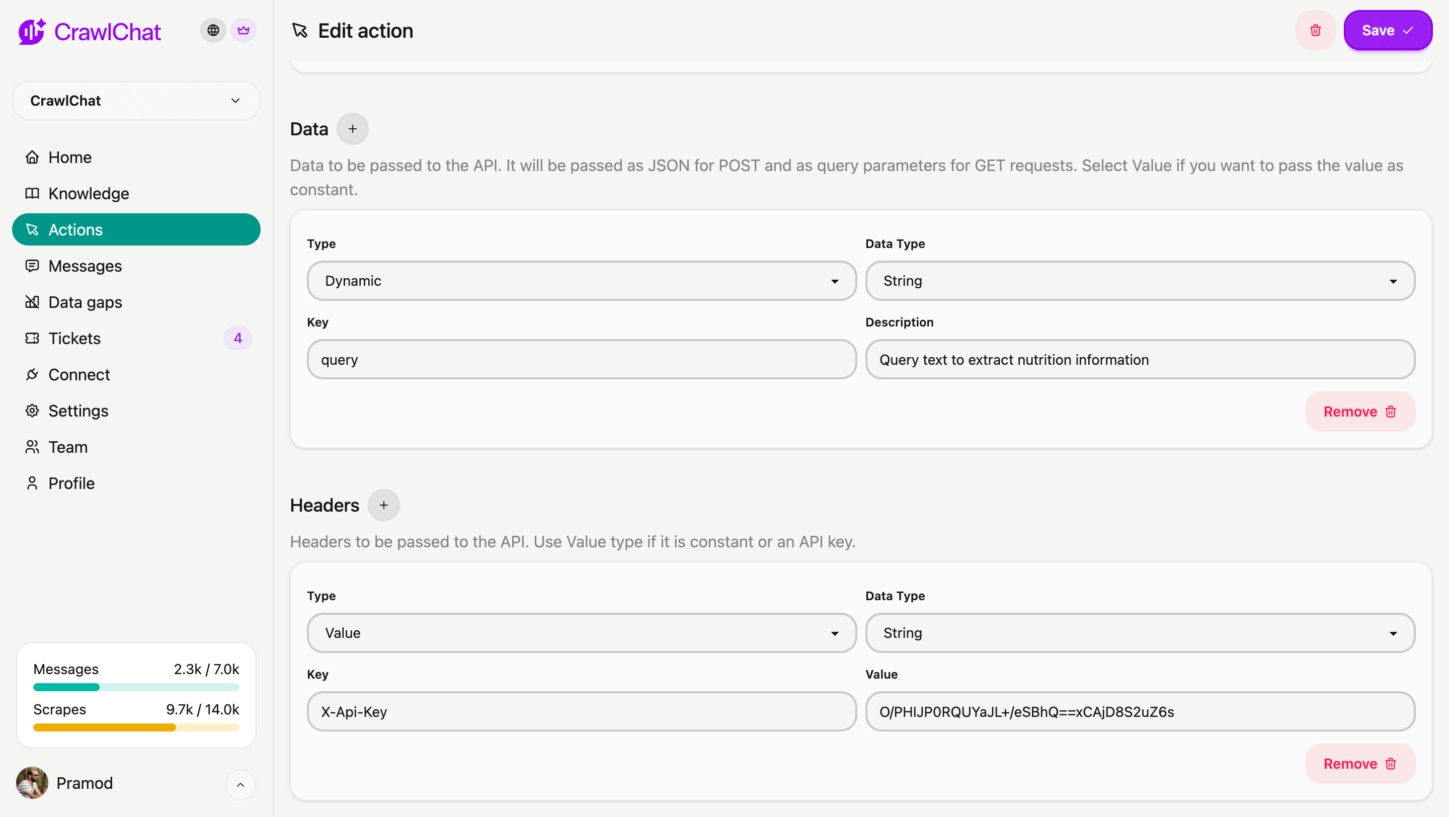 You can configure Headers in same way as explained above. Once you add an action, the chatbot would instantly start using it as you described it.