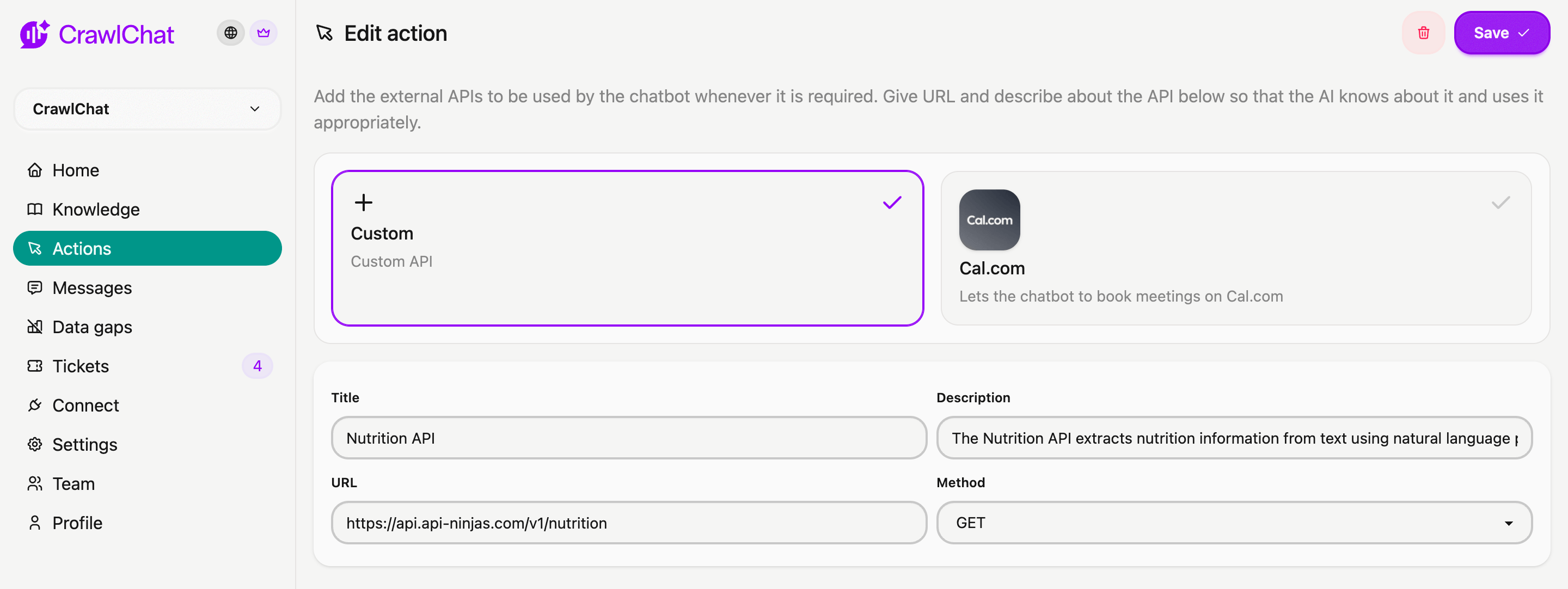 Now you can let the CrawlChat chatbot perform external actions using APIs. You can add APIs as actions to external systems such as Zendesk, Shopify, or your own application.