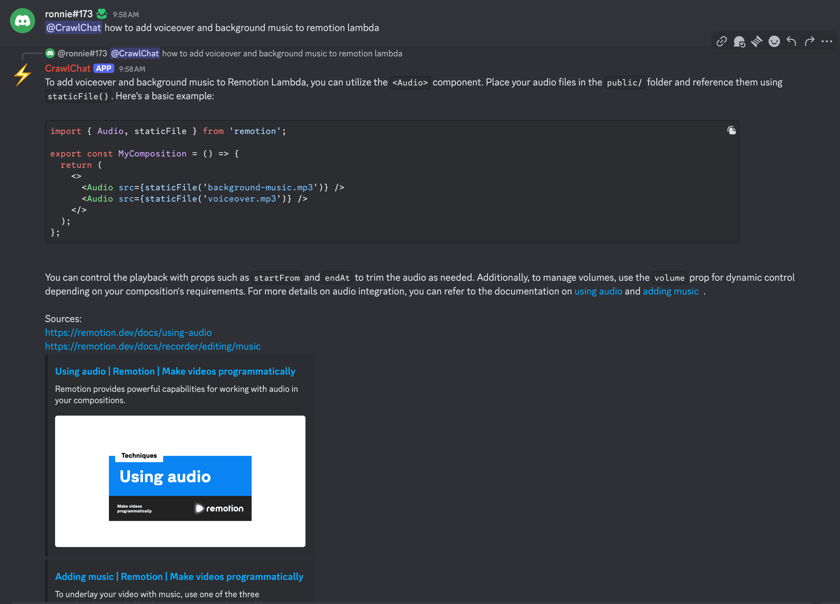 Jonny, the maker of Remotion is keen on it and wanted to integrate CrawlChat with Remotion documentation so that they can embed the Ask AI button on the Remotion's documentation site, have a Discord Bot that uses the documentation and answers queries from the community, and a MCP Server to take the documentation right into the developers AI workflow.