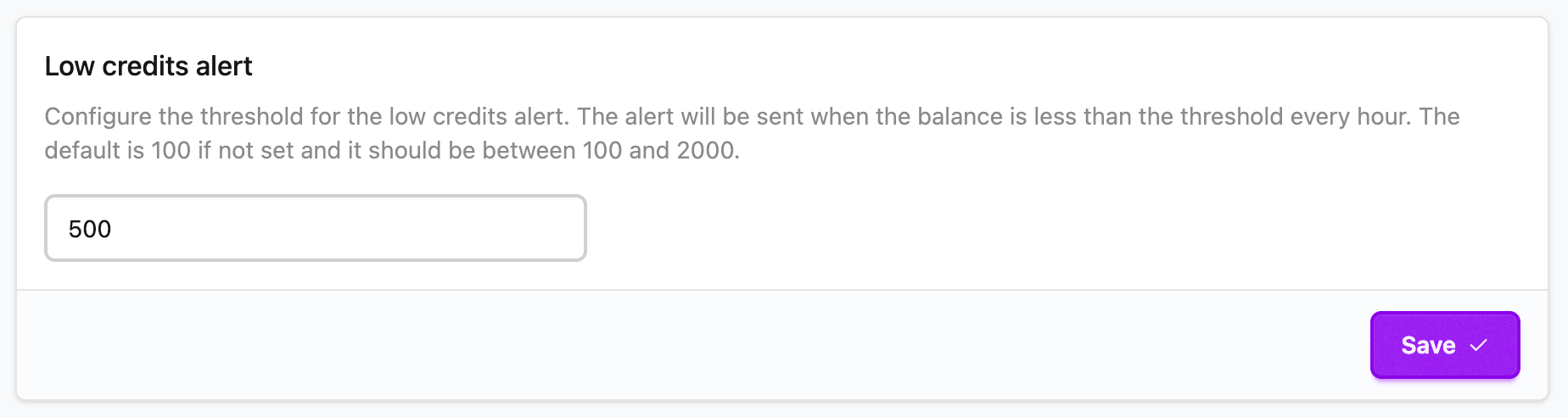 Now you can configure the Low credits threshold. Once your credits reach lower than this number all the team members will start getting notified on email about the low credits. The email will be sent whenever credits are being consumed with at least one hour gap. Configure it from here