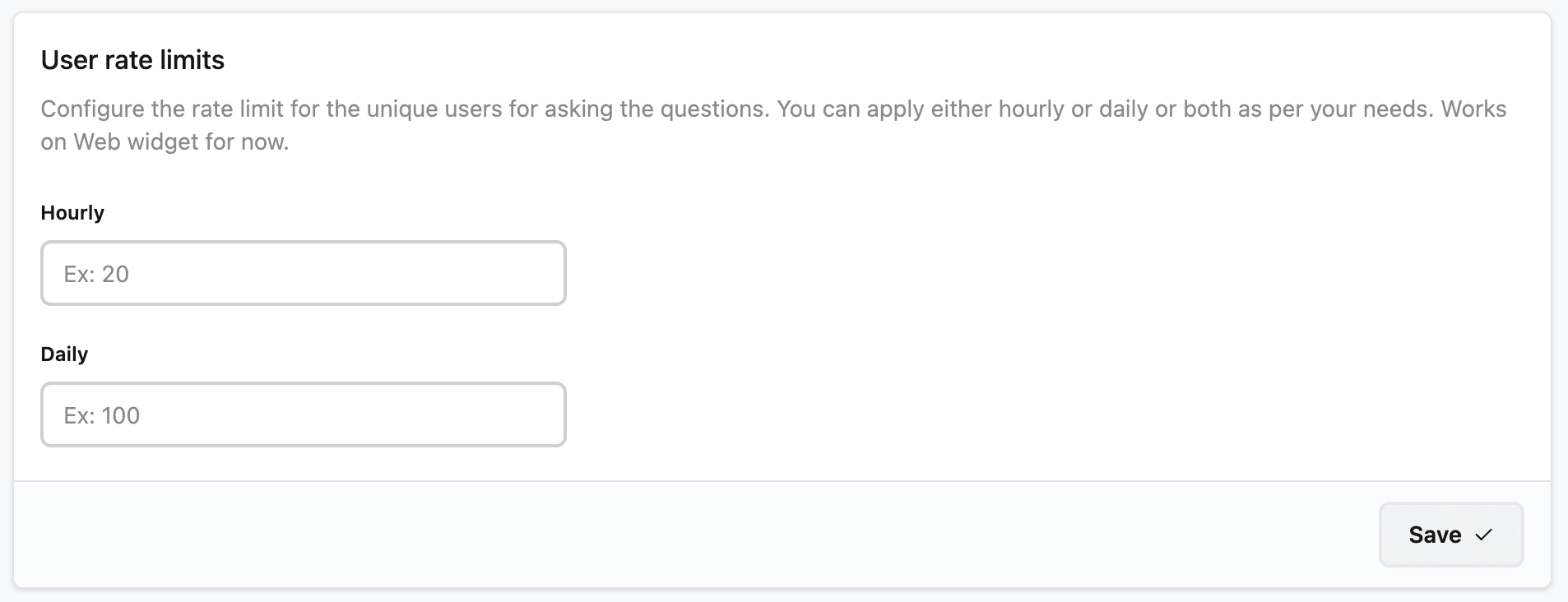 Now you can apply rate limits on unique users for the questions they ask. You can set either Hourly or Daily or both limits. To start with, it is rolled out for web widget. The user gets notified if the limit is reached. You can configure the limits from Settings page.