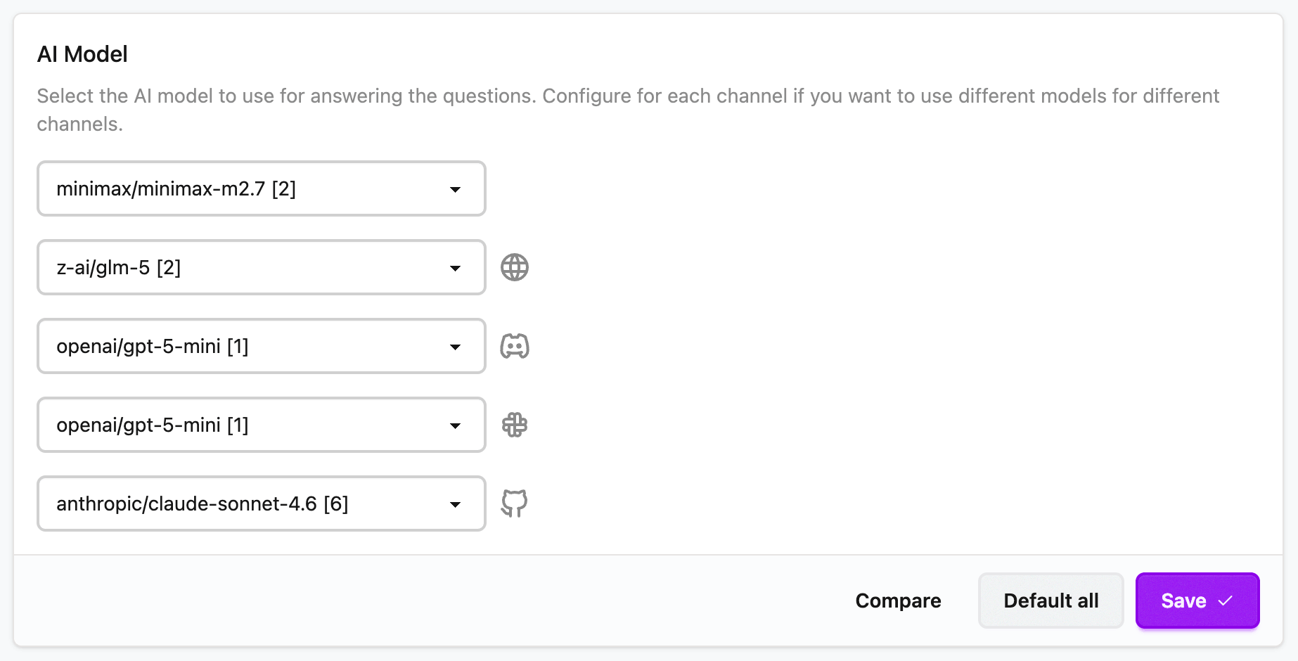 You can now configure an AI model separately for each channel, such as Web embed, Discord bot, Slack app, and GitHub bot. This gives you the flexibility to tailor models to different use cases and user usage patterns. Configure it from here.