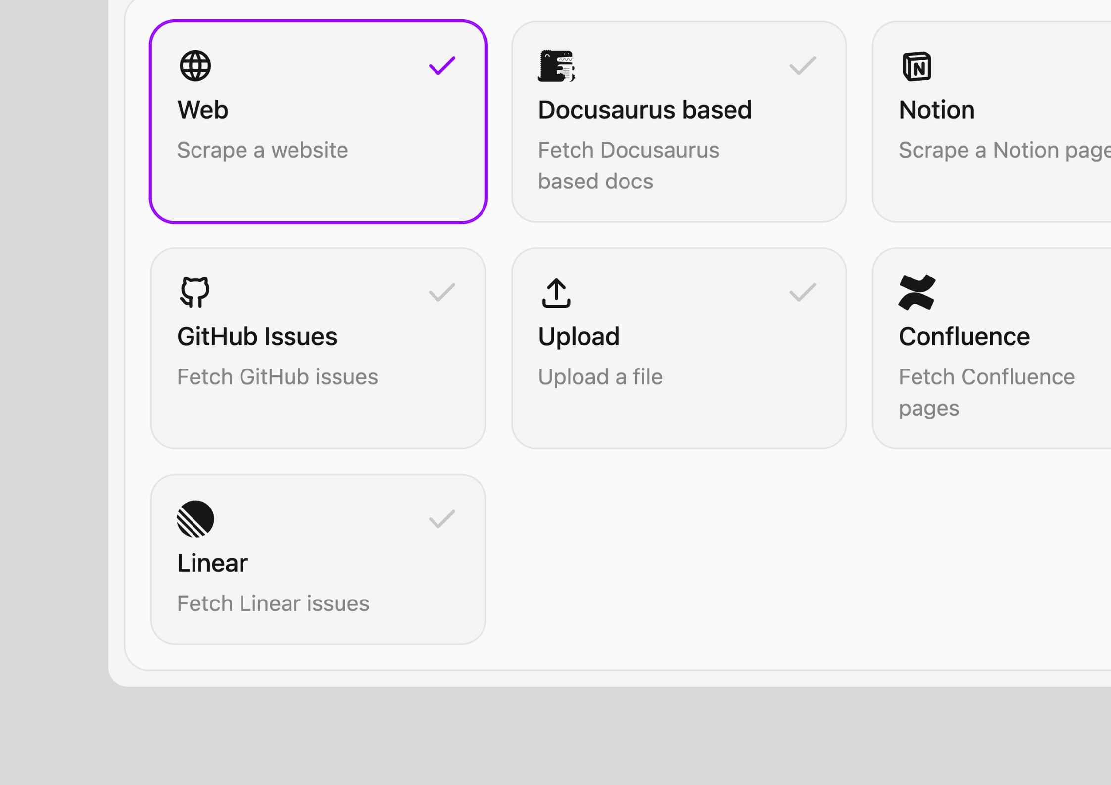 Add your documentation to the knowledge base so the chat assistant can answer questions. CrawlChat offers a wide range of connectors to instantly import your existing documentation into the knowledge base.