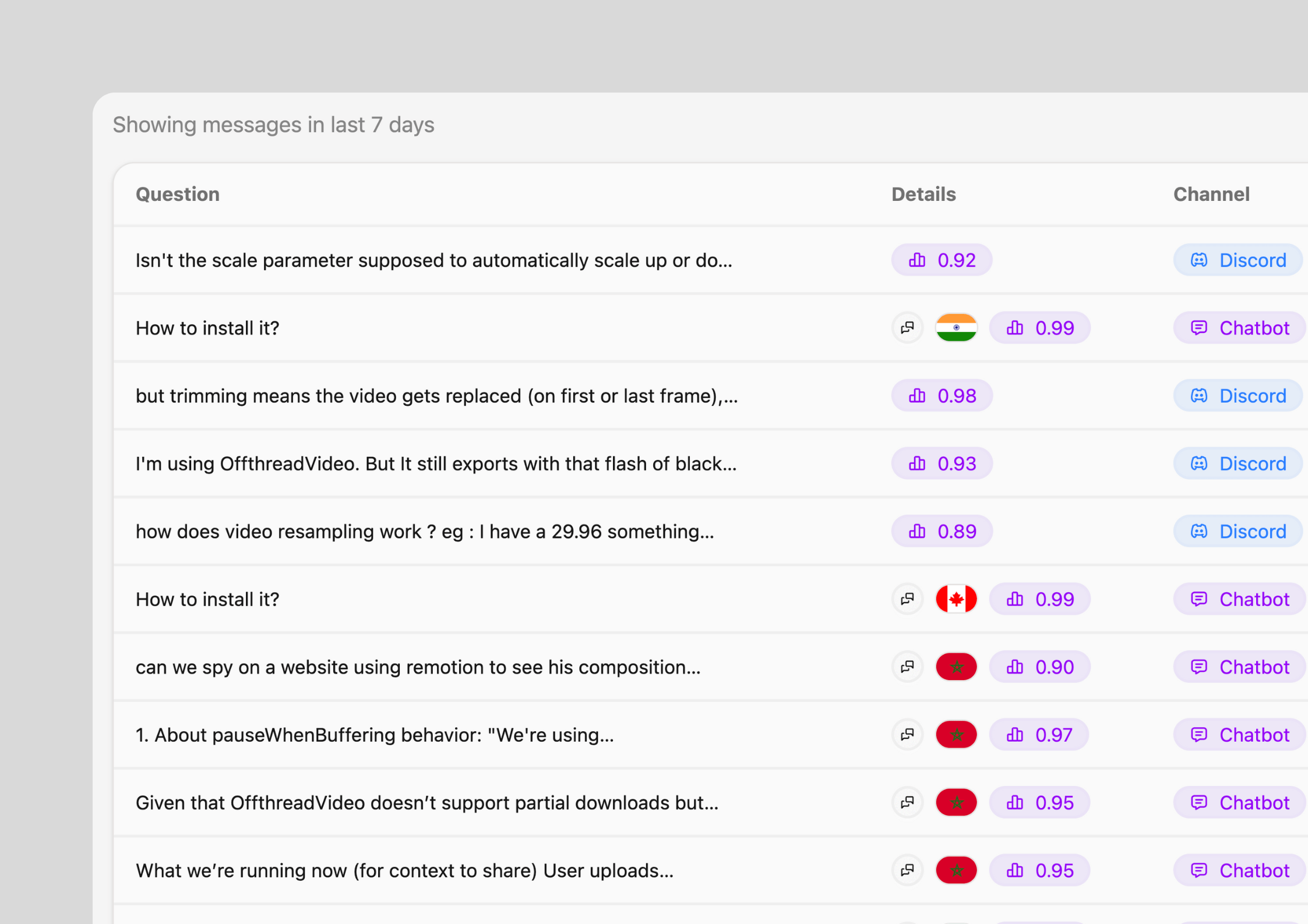 Deliver your documentation to your community where they already engage, reducing friction in getting answers. Embed the chat assistant on these platforms to reach your community effectively.